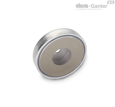 Magneții de retenție din oțel inoxidabil GN 50.45 sunt montați intr-o carcasă din oțel și inel de plastic / izolator într-un sistem care protejează și consolidează magnetul pentru transmisia optimă a fluxului magnetic pe suprafața magnetică.