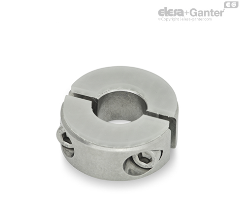 Șaiba de amortizare fixată a colierelor pentru axuri secționate GN 7072.3 absoarbe șocuri ușoare și are un efect de amortizare a sunetului atunci când colierele intră în contact cu alte componente.