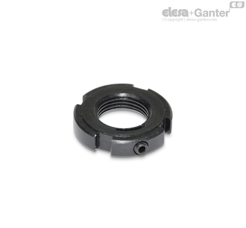 Piulițele canelate GN 1804.2 cu blocarea filetului pot fi asigurate împotriva răsucirii prin blocarea axului filetat cu ajutorul unui șurub de reglare d4. Blocarea se face fără deteriorări astfel că piulițele pot fi blocate ori de câte ori este nevoie.