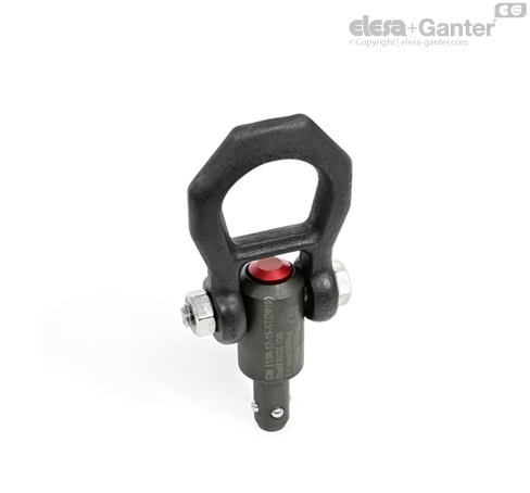 Inelele de ridicare GN 1130 sunt elemente portante concepute pentru o utilizare rapidă și ușoară. Apăsarea butonului roșu din aluminiu va elibera efectul de blocare al bilelor de blocare, permițând deplasarea bolțului de ridicare în sau în afara alezajului găurii de fixare. Ochiul se rotește cu cel puțin 180° și are o traversă de siguranță ca măsură de protecție împotriva acționării involuntare a butonului. În funcție de direcția de tragere, bolțul cu bilă se poate deplasa liber cu 360° în gaura de fixare.