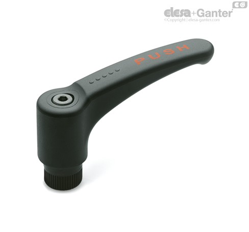 Tehnopolimer pe bază de poliamidă ranforsată cu fibră de sticlă (PA), culoare gri-negru, finisaj mat. Inscripție roșie cu „PUSH” imprimată pe corpul manetei (evitați contactul cu solvenți, alcool sau detergenți care conțin alcool).