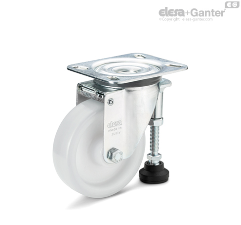 Roata cu picior antiderapant face posibilă ridicarea cărucioarelor sau a utilajelor cu scopul funcționării în siguranță, garantând în același timp posibilitatea de a deplasa frecvent platforma cu rotile prin simpla reglare a hexagonului piciorului, transformând eficient stațiile de lucru fixe și echipamentul de lucru în stații de lucru mobile.